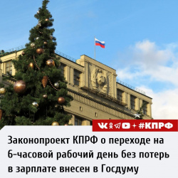 Депутаты Госдумы от КПРФ Юрий Афонин, Георгий Камнев и Алексей Куринный внесли в Госдуму законопроект, которым предлагается сократить рабочее время россиян до 6 часов в день при сохранении заработной платы. Изменения рекомендовано внести в Трудовой кодекс РФ.