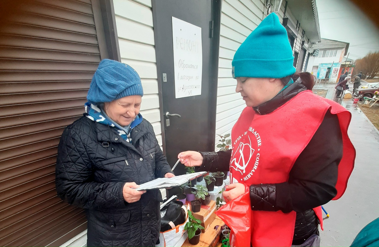 На фото: В Тюкалинске (первый секретарь МО КПРФ Юлия Тимошенко) наши товарищи обычно раздают листовки и собирают подписи под бюллетенями Народного референдума на воскресном рынке.