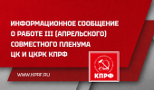 Информационное сообщение о работе III (апрельского) совместного пленума ЦК и ЦКРК КПРФ 25 апреля в Подмосковье состоялся III (апрельский) совместный пленум Центрального Комитета и Центральной Контрольно-ревизионной комиссии КПРФ. В его работе приняли участие члены центральных выборных органов партии, секретари её региональных комитетов, депутаты различных уровней, представители ЛКСМ РФ и других общественных объединений. Общее число участников превысило 600 человек. 29.04 12:58
