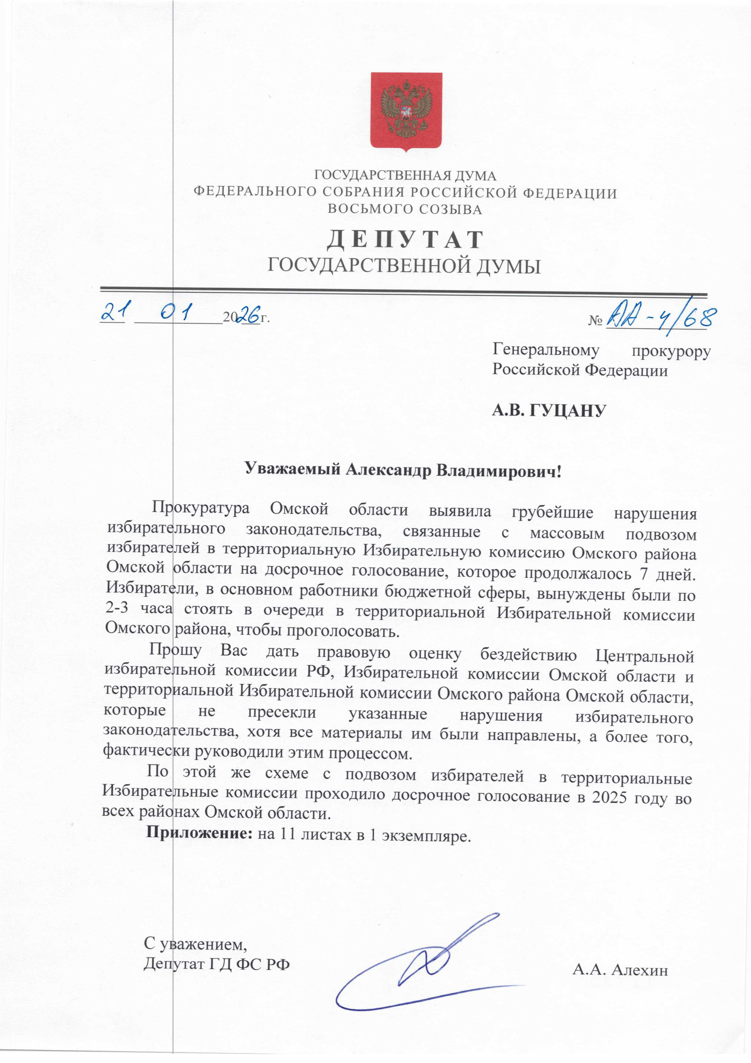 Депутат Госдумы (фракция КПРФ) Андрей Алехин направил генеральному прокурору Российской Федерации А. В. Гуцану обращение.